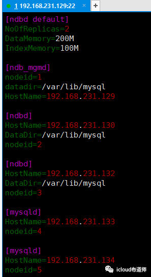 [ndbd default]NoOfReplicas=2DataMemory=200MIndexMemory=100M[ndb_mgmd]nodeid=1datadir=/var/lib/mysqlHostName=192.168.231.129[ndbd]HostName=192.168.231.130DataDir=/var/lib/mysqlnodeid=2[ndbd]HostName=192.168.231.132DataDIR=/var/lib/mysqlnodeid=3[mysqld]HostName=192.168.231.133Datdir=/var/lib/mysqlnodeid=4[mysqld]HostName=192.168.231.134DataDir=/var/lib/mysqlnodeid=5