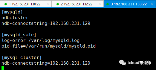 [mysqld]ndbclusterndb-connectstring=192.168.231.129[mysqld_safe]log-error=/var/log/mysqld.logpid-file=/var/run/mysqld/mysqld.pid[mysql_cluster]ndb-connectstring=192.168.231.129