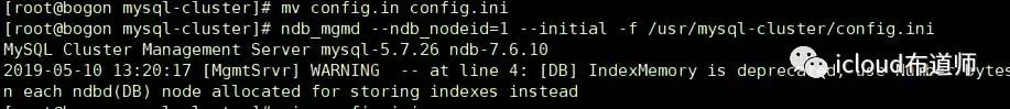 [root@bogon mysql]# ndb_mgmd --ndb_nodeid=1 --initial -f usr/mysql-cluster/config.iniMySQL Cluster Management Server mysql-5.7.26 ndb-7.6.10