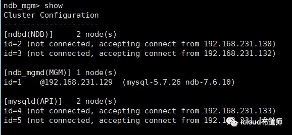 Cluster Configuration---------------------[ndbd(NDB)] 2 node(s)id=2 (not connected, accepting connect from 192.168.231.130)id=3 (not connected, accepting connect from 192.168.231.132)[ndb_mgmd(MGM)] 1 node(s)id=1 @192.168.231.129 (mysql-5.7.26 ndb-7.6.10)[mysqld(API)] 2 node(s)id=4 (not connected, accepting connect from 192.168.231.133)id=5 (not connected, accepting connect from 192.168.231.134)