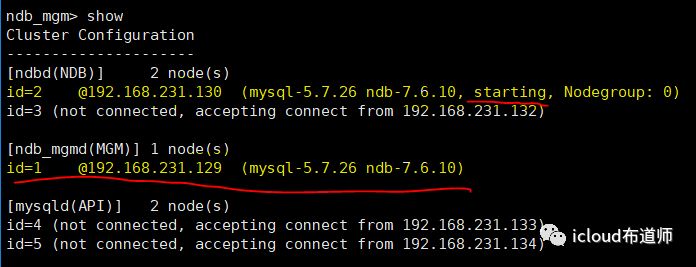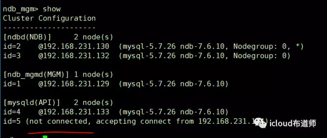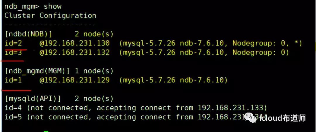 ndb_mgm> showCluster Configuration---------------------[ndbd(NDB)] 2 node(s)id=2 @192.168.231.130 (mysql-5.7.26 ndb-7.6.10, Nodegroup: 0, *)id=3 @192.168.231.132 (mysql-5.7.26 ndb-7.6.10, Nodegroup: 0)[ndb_mgmd(MGM)] 1 node(s)id=1 @192.168.231.129 (mysql-5.7.26 ndb-7.6.10)[mysqld(API)] 2 node(s)id=4 @192.168.231.133 (mysql-5.7.26 ndb-7.6.10)id=5 @192.168.231.134 (mysql-5.7.26 ndb-7.6.10)