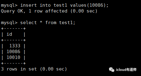 mysql> insert into test1 values(10086);Query OK, 1 row affected (0.00 sec)mysql> select * from test1;+-------+| id |+-------+| 1333 || 10086 || 10010 |+-------+3 rows in set (0.00 sec)