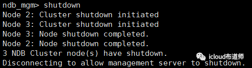 ndb_mgm> shutdownNode 2: Cluster shutdown initiatedNode 3: Cluster shutdown initiatedNode 3: Node shutdown completed.Node 2: Node shutdown completed.3 NDB Cluster node(s) have shutdown.