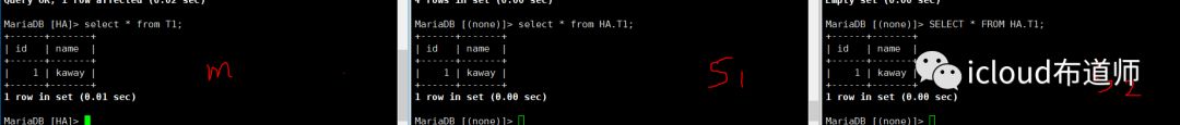 MariaDB [(none)]> insert into HA.T1 values(1,'下班');