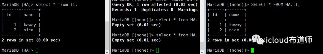 MariaDB [HA]> insert into T1 values (2,'nice');