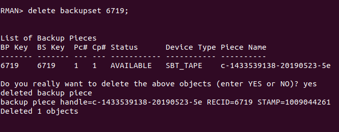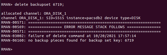 对于SBT_TAPE类型的备份,如果直接删除备份集会报错: