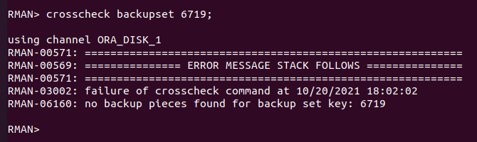 使用crosscheck对备份集进行检查,一样无法查询到备份集