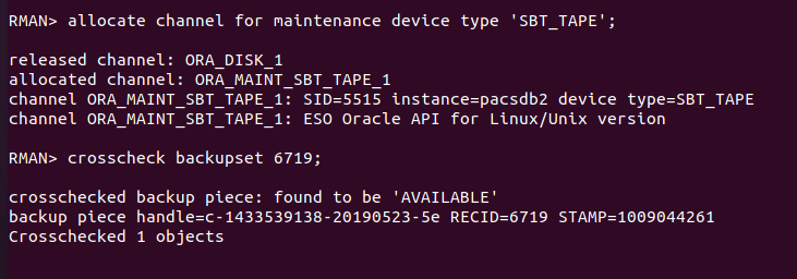RMAN> allocate channel for maintenance device type 'SBT_TAPE';
