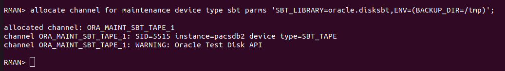 RMAN> allocate channel for maintenance device type sbt parms 'SBT_LIBRARY=oracle.disksbt,ENV=(BACKUP_DIR=/tmp)';