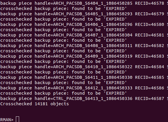 执行后,因为/tmp下并没有备份文件,所有的TAPE类型的备份集都被标识为expired