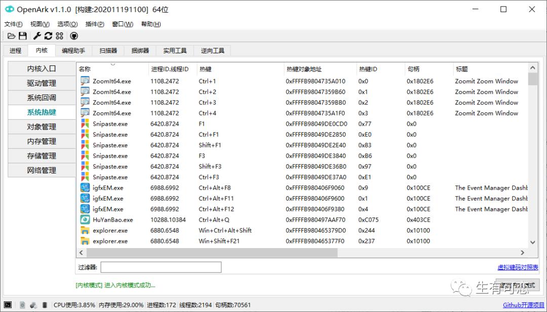 查看系统快捷键需要管理员权限和内核权限,使用前要以管理员权限运行程序,程序右下角有一个按钮“进入内核模式”,点击后我的屏幕变红了一下下,然后软件会提示【内核模式】进入内核模式成功。当进行内核模式后,系统所有的快捷键都会刷出来。在相应的快捷键上右击,就能删除对应的快捷键。