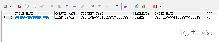 select t.table_name,t.column_name,t.segment_name,t.tablespace_name,t.index_name,t.partitionedfrom dba_lobs twhere t.table_name = 'MET_MRS_BASE_IMAGE'AND T.owner = 'XYHIS';