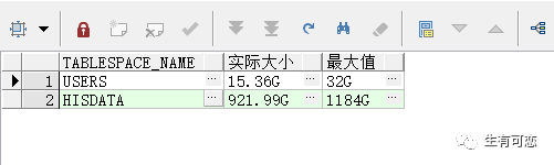 select t.tablespace_name,round(sum(t.bytes) (1024 * 1024 * 1024), 2) || 'G' 实际大小,round(sum(t.maxbytes) (1024 * 1024 * 1024)) || 'G' as 最大值from dba_data_files tWHERE T.tablespace_name = 'HISDATA'or t.tablespace_name = 'USERS'group by t.tablespace_name;