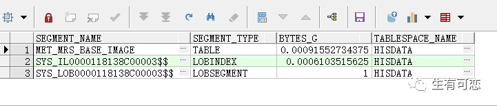 select t.segment_name,t.segment_type,t.bytes (1024 * 1024 * 1024) BYTES_G,t.tablespace_namefrom dba_segments twhere t.segment_name in ('SYS_LOB0000118138C00003$$','SYS_IL0000118138C00003$$','MET_MRS_BASE_IMAGE')and t.owner = 'XYHIS';