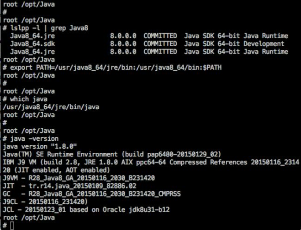安装完成后,可使用 lslpp 验证安装结果;在将 Java 8 的路径添加到环境变量中之后,也可使用 java –version 验证当前默认的 Java 版本: