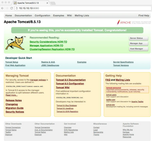 打开浏览器,在地址栏输入 http://IP address:8080 ,熟悉的 Tomcat 默认页面出现,安装完成: