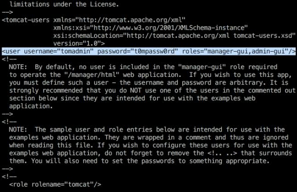 在经过上述步骤成功打开的仅为 Tomcat 默认页面,如需查看服务状态、管理应用等功能,则需要在 Tomcat 服务器中添加 manager-gui 和 admin-gui 两个用户角色。一般情况下,建议添加两个用户并分别赋予两个不同的角色,亦可只添加一个用户同时赋予这两个角色。为方便演示,此次只添加一个用户,并同时赋予这两个角色,需要执行的操作也很简单,只需要编辑 opt/tomcat/conf/tomcat-users.xml 文件,添加用户名、密码和角色即可: