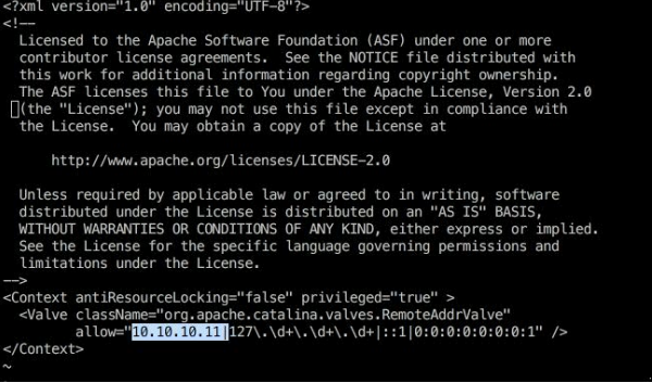 最后,还需将允许访问 Tomcat 服务器的系统 IP 地址列表添加到 /opt/tomcat/apache-tomcat-8.5.13/webapps/manager/METAINF/context.xml 和 /opt/tomcat/apache-tomcat-8.5.13/webapps/hostmanager/META-INF/context.xml 这两个文件: