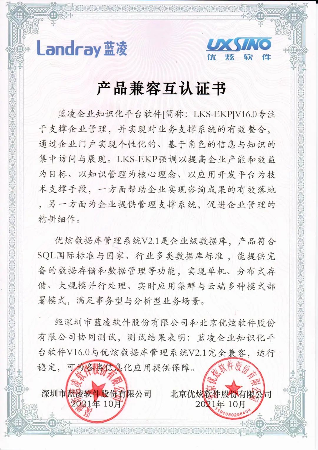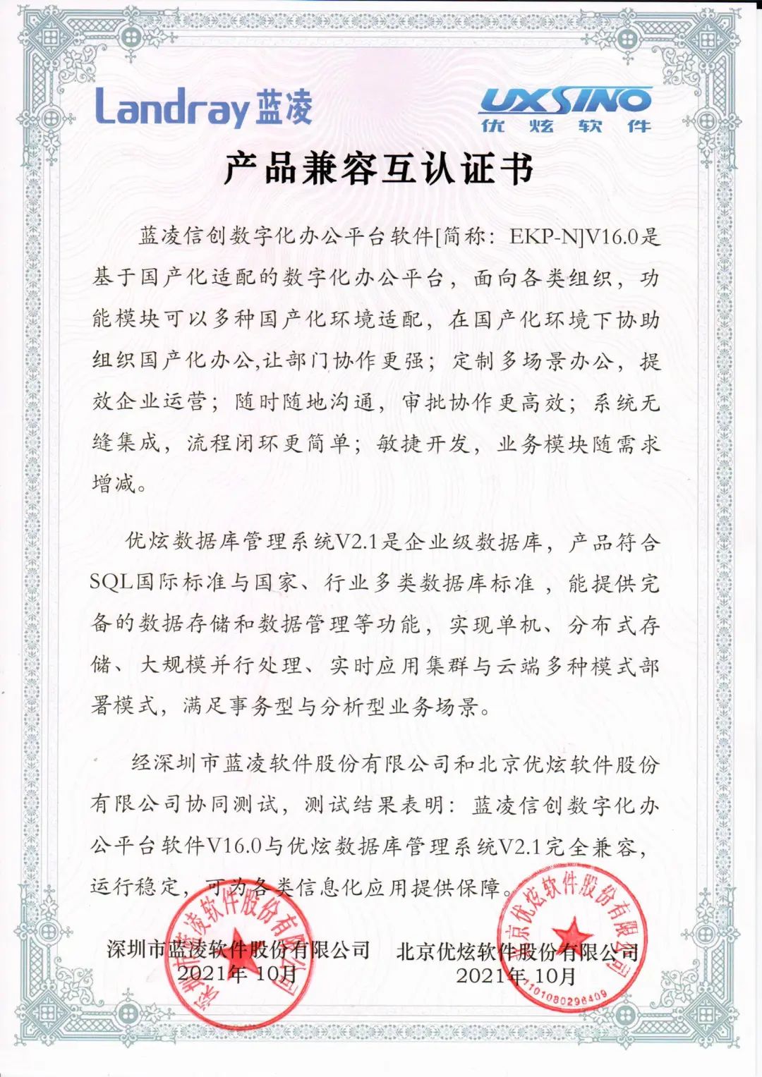 除此次的产品兼容性互认证测试外,优炫软件与蓝凌软件在未来将发挥各自优势,在金融、政府、电信、地产和能源等行业展开深度合作,为客户提供更多安全高效的服务方案,用先进科技赋能智慧办公,携手建立全面、开放、先进的数字化生态体系。