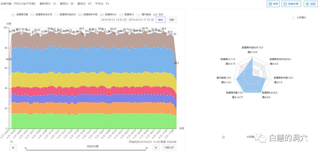 某省PMS系统的健康指标突然严重下降,多项指标严重失分。通过雷达图发现数据库IO和数据库并发方面丢分严重,从而导致数据库总体健康维度分数突降。下面是本次事件的处置过程:
