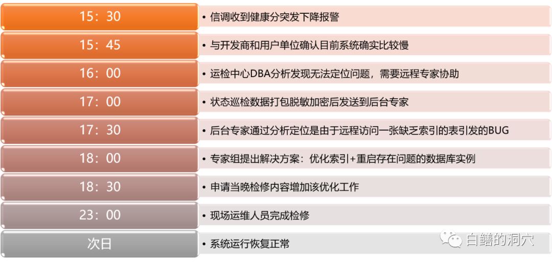由于现场的运维人员自己感觉无法处置此次故障,D-SMART也没有提供此类问题的运维诊断工具,于是现场运维人员将状态巡检报告导出为WORD文档,发给了三线专家。三线专家在10分钟内就定位了这是一个我们运维经验库中还没有包含的系统故障,是由于DBLINK访问某张缺乏索引的大表触发某个BUG引起的DFS LOCK HANDLE等待。提出的处置方案是必须重启数据库实例,同时对于那张表需要建索引。于是当天晚上在检修窗口中完成了此次操作,第二天系统恢复正常。