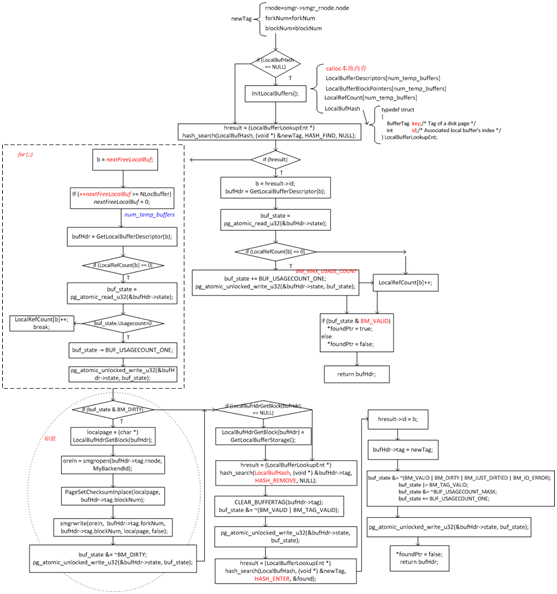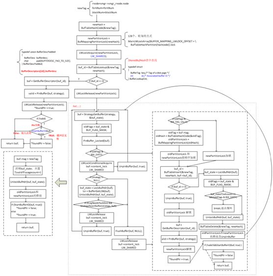 5)buf_id<0,即未在hash表SharedBufHash:buf_state的refcount==1且不为BM_DIRTY,表示无人使用该buf,退出循环,将buf->tag=newTag,最后释放相关锁
