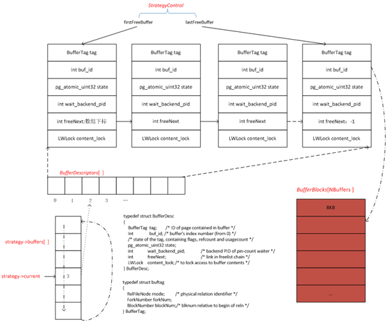 1、Buffer由数组BufferDescriptor[]数组进行管理。该数组由函数InitBufferPool创建,大小为NBuffers个成员即BufferDesc。该数组创建后由StrategyControl进行管理,firstFreeBuffer为链表头,指向链表第一个成员;lastFreeBuffer指向链表尾;所有free list中成员由freeNext串起来,该值为数组下标。