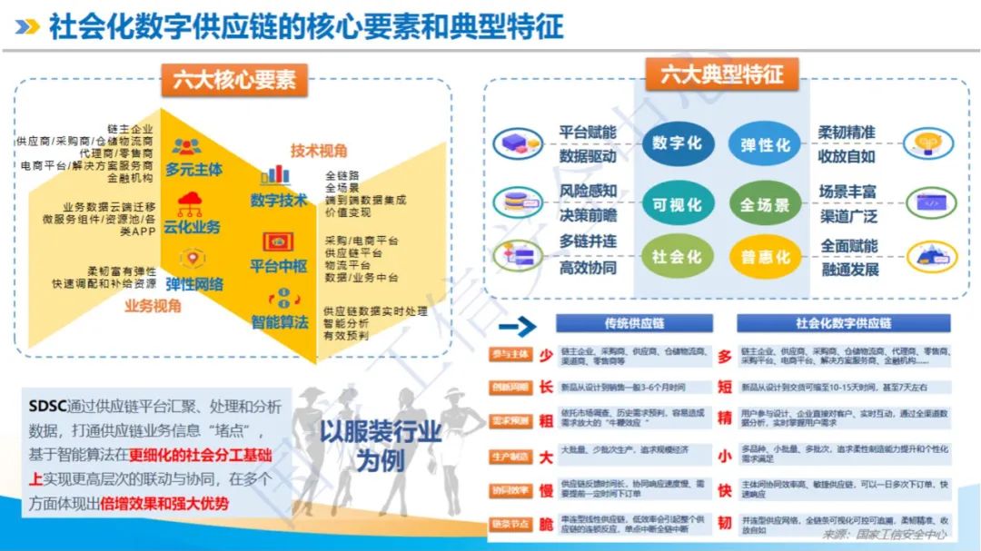 报告分别从技术和业务视角总结了社会化数字供应链的六大要素,即数字技术、平台中枢、智能算法以及多元主体、弹性网络和云化业务。与传统供应链相比,社会化数字供应链体现出数字化、可视化、社会化、弹性化、全场景及普惠化等六大特征。