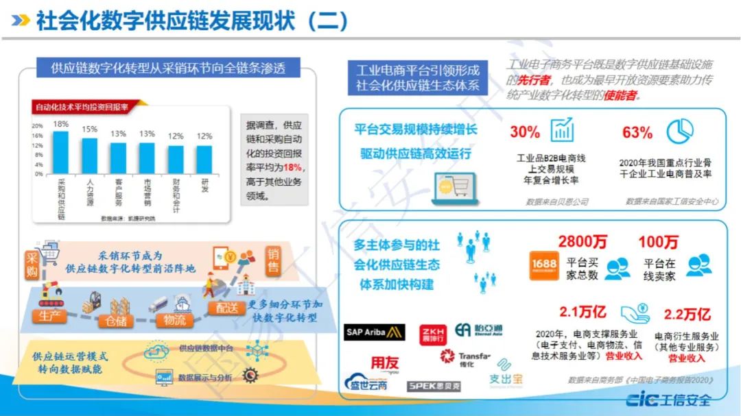 从实践来看,供应链数字化转型一般先从营销、采购等交易环节切入,逐步向供应链全环节拓展,越来越多的数字技术已经在供应链中找到了落地场景,我国整体处于起步阶段。工业电子商务平台既是推动数字供应链发展的先行者,也成为助力传统产业数字化转型的使能者。