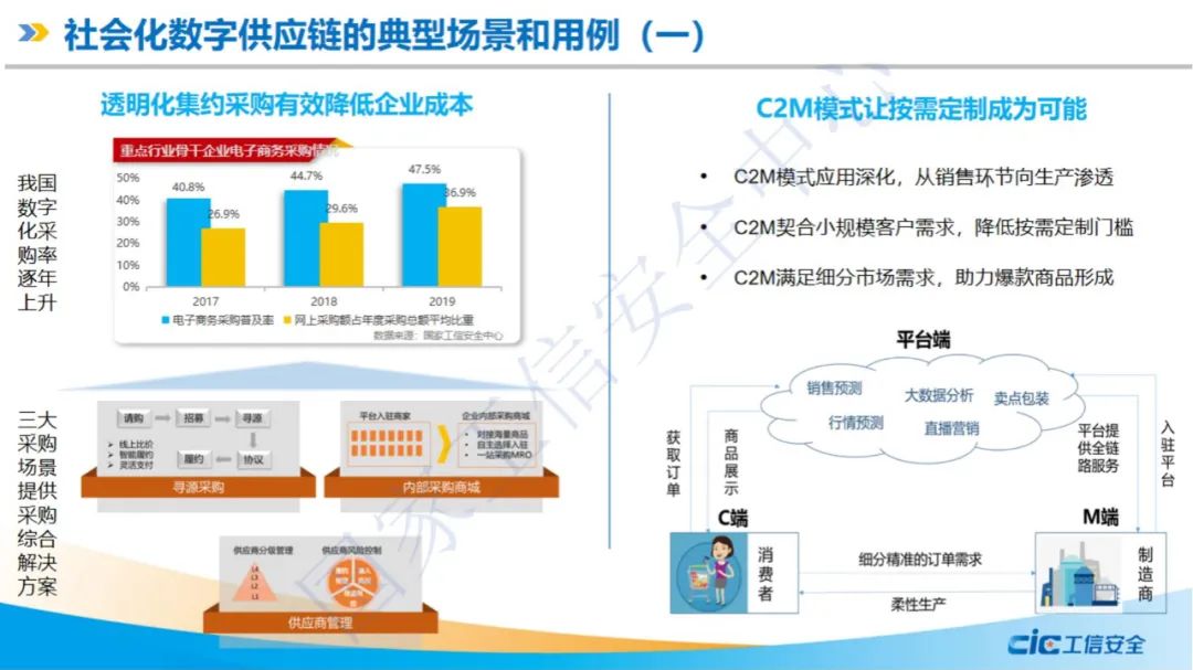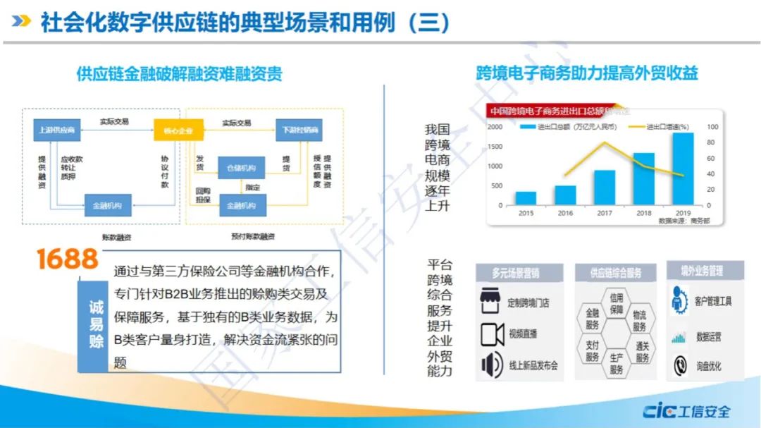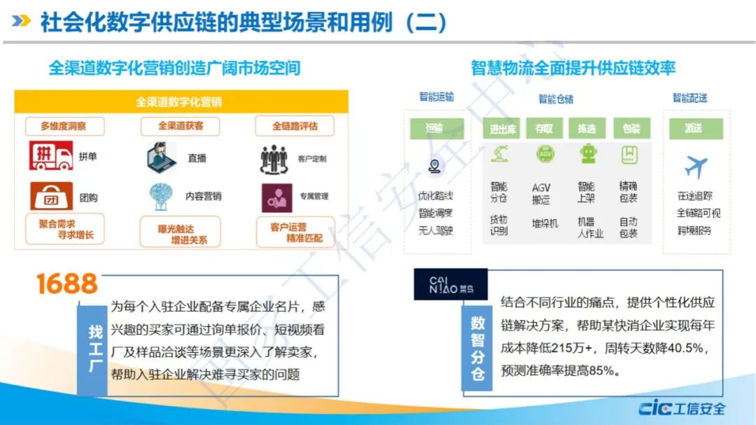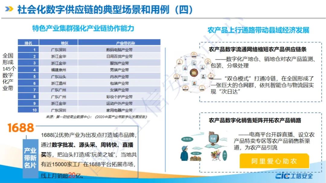 报告结合1688等平台的典型做法,详细展示了社会化数字供应链的八类具体场景和用例。一是透明化集约采购有效降低企业成本,二是基于柔性生产的C2M模式让按需定制成为可能,三是全渠道数字化营销创造广阔市场空间,四是智慧物流全面提升供应链效率,五是供应链金融破解中小微企业融资难融资贵困局,六是跨境电商赋能企业提升企业供应链全球化运营能力,七是打造特色产业集群强化产业链协作能力,八是构建农产品上行通路带动县域经济发展。