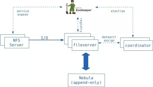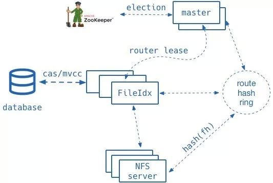 master 模块负责维护一张路由表,路由表可以理解成一个由虚节点组成的一致性哈希环,每个 FileIdx 实例负责其中的部分虚节点,master 通过心跳和各个实例节点进行存活性探测,并用租约机制告知 FileIdx 实例和各个 NFSServer 具体的虚节点由谁负责处理。如果某个 FileIdx 实例发生故障,master 只需要在当前租约失效后将该节点负责的虚节点分配给其他实例处理即可。