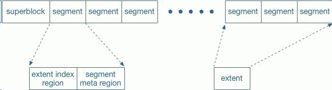 extent index segment meta region:extent/segment 索引区域,记录了每个 extent 对应的 segment 列表,以及 segment 的状态 (是否可用) 等信息。