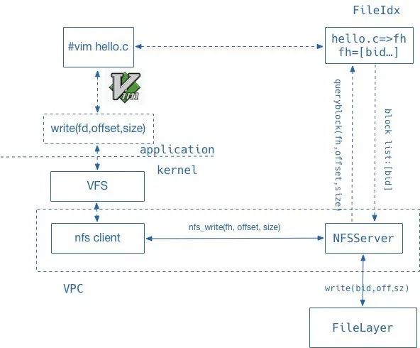 4. NFSServer 拿到需要操作的 block 的句柄 (bid) 后去请求 FileLayer 进行 IO 操作 (每个 bid 在 FileLayer 中代表一个文件)。