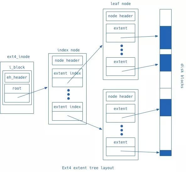 在 Ext4/XFS 等更先进的文件系统设计中,inode 被设计成使用 extent-based 的方式来实现,每个 extent 不再被固定的 block 大小限制,相反它可以用来表示一段不定长的磁盘空间,如下图所示: