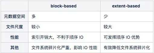 中心化索引面临的性能瓶颈主要在数据块的分配上,我们可以类比一下单机文件系统在这方面的设计思路。早期文件系统的 inode 对数据块的管理是 block-based,每次 IO 都会申请 block 进行写入,典型的 block 大小为 4KB,这就导致两个问题: