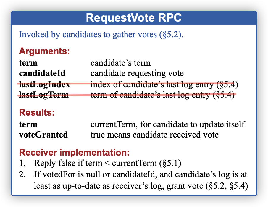 type RequestVoteArgs struct {Term int // 请求者任期CandidateId int // 请求者 id}type RequestVoteReply struct {Term int // 回复者任期VoteGranted bool // 是否投票,true 则投票}