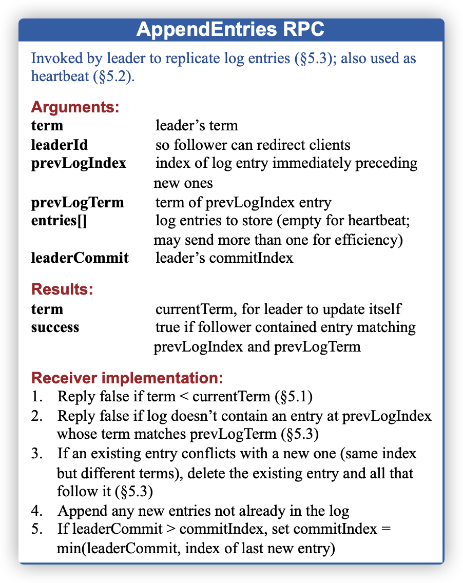 同样地,日志同步也需要与其它节点进行沟通,对应论文中的AppendEntriesArgs RPC请求,如下图所示:
