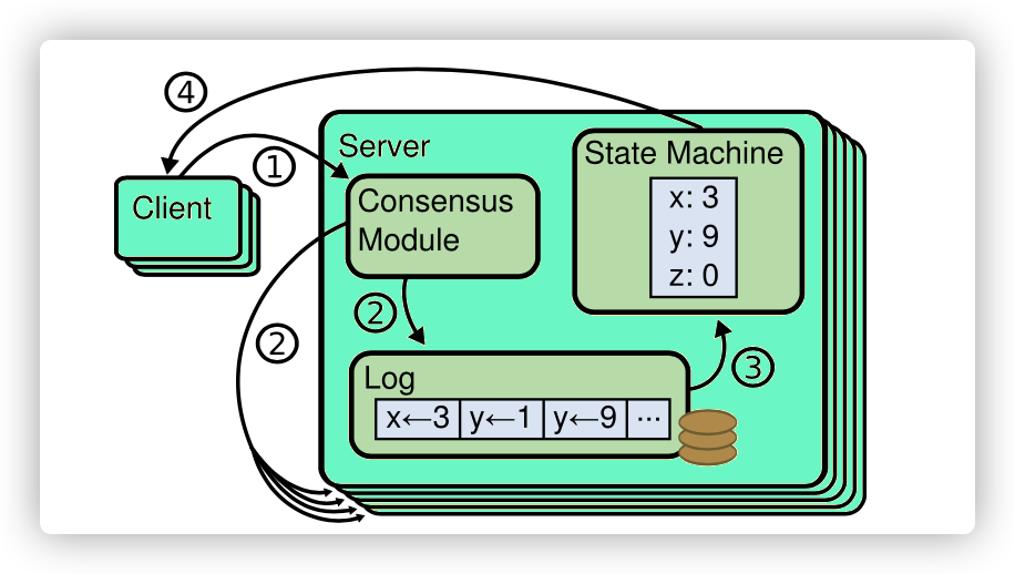 已提交的日志被应用后才会生效,那么数据的可见性由何种机制来保证了?Raft使用了状态机来保证相同日志被应用不同节点后,数据是一致的。如下图所示: