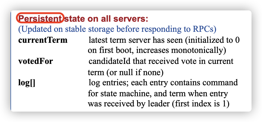 2条黄金铁律:发现任期大的立即成为其追随者;任何引起currentTerm,votedFor,log改变的操作后,立即持久化数据。