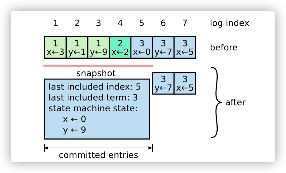 x,y值有多条日志,但实际上大部分日志都是可被删除的,因此快照机制直接将1~5号日志融合,合并成一个快照块。