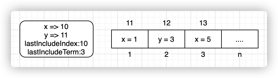 type rLog struct {Entries []LogEntry+ LastIncludedIndex int+ LastIncludedTerm int}func defaultRLog() rLog {return rLog{Entries: []LogEntry{{Term: 0,Command: nil,},},+ LastIncludedIndex: 0,+ LastIncludedTerm: 0,}}func (l *rLog) entryAt(index int) LogEntry {+ if index < l.LastIncludedIndex || index > l.LastIncludedIndex+len(l.Entries) {+ panic(fmt.Sprintf("lastIncludeIndex: %d, but index: %d is invalid", l.LastIncludedIndex, index))+ }+ return l.Entries[index-l.LastIncludedIndex]}// 最后序号func (l *rLog) last() int {if len(l.Entries) == 0 {return 0}+ return len(l.Entries) + l.LastIncludedIndex - 1}// 最后任期func (l *rLog) lastTerm() int {+ return l.Entries[l.last()-l.LastIncludedIndex].Term}// 第一个序号func (l *rLog) first() int {+ return l.LastIncludedIndex}// 日志长度func (l *rLog) size() int {+ return len(l.Entries) + l.LastIncludedIndex}