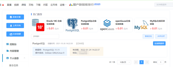 这里可以针对你感兴趣的申请练习环境。1分钱。我想1分钱买不了吃亏买不了上当。试试吧。我选了一个PostgreSQL的环境(因为其他数据库rpm安装就行)PG还是推荐源码安装(因为RPM安装的有些没有,而且我学认证的时候老师就说推荐源码安装)所以为了省力就那PG的试试。