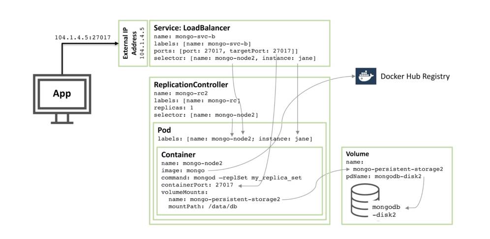 Service被命名为mongo-svc-b ,并且有一个唯一的,外部IP地址(在这个实例中,Kubernetes被赋值104.1.4.5)。