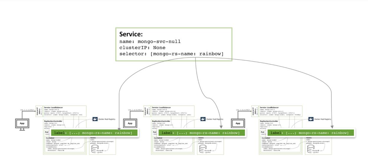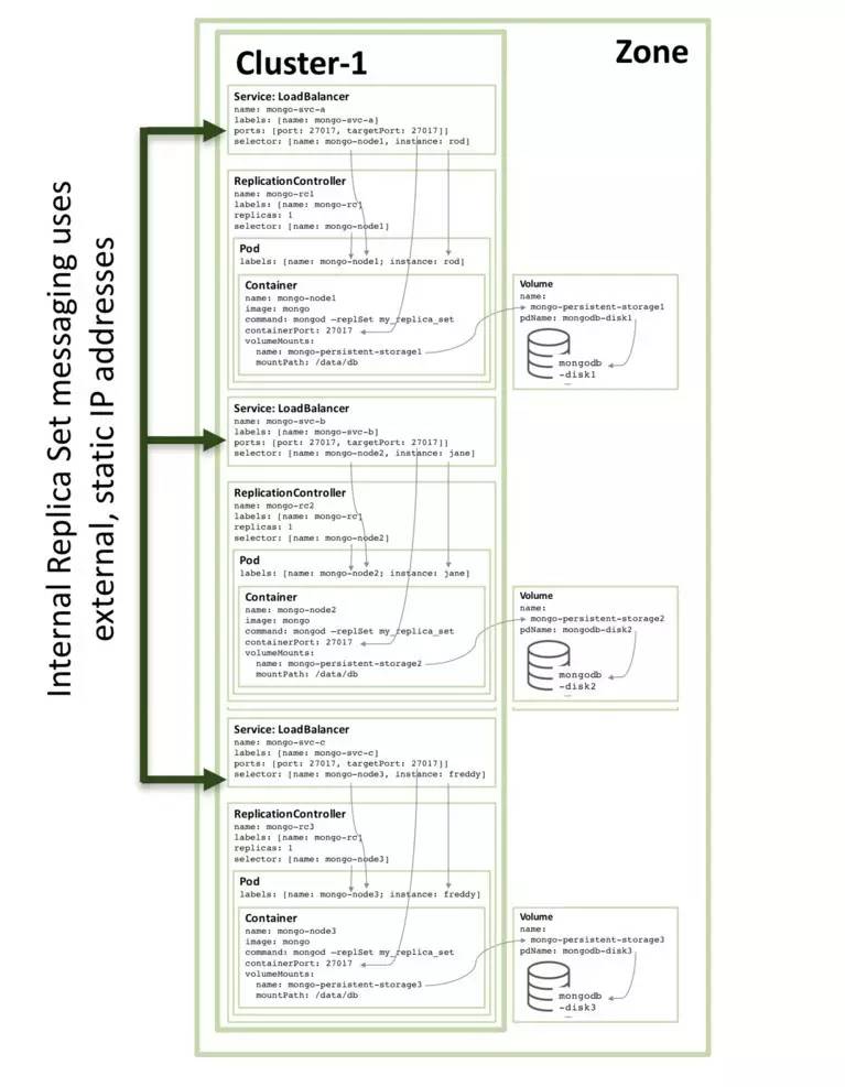 每个副本集合的构件都将作为自己的pod被运行,伴随着暴露外部IP地址和端口的服务。这个“固定的”(fixed)IP地址十分重要,因为外部应用程序和其他副本集成构件可以在pod重新调度的时候保持不变,继续依赖它。