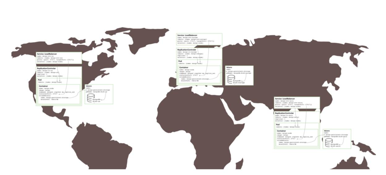 令人吃惊的是,为了分别在三个区域内创建相似的副本集合,几乎不需要改变什么——这就要求三个集群。每个集群都需要各自的KubernetesYAML文件,这个文件只定义了pod,Replication Controller和service作为副本集合的一个构件。然后为每个区域都创建一个集群,持久性数据和MongoDB。