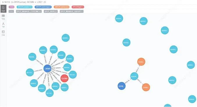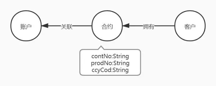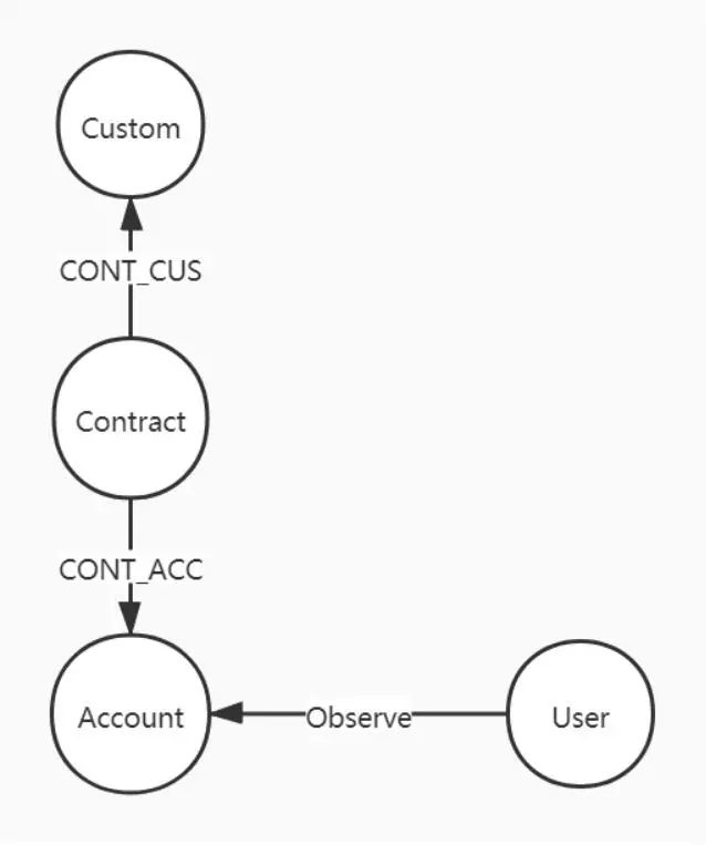如果采用图数据库创建则容易得多,只需要为客户、合约、账户、用户创建节点,并且节点不需要主键、外键,也不需要中间表,只保留必要的属性即可。各个节点直接通过关系指向来表达节点之间的复杂关系,如图3所示。