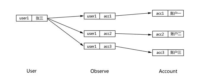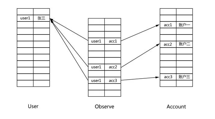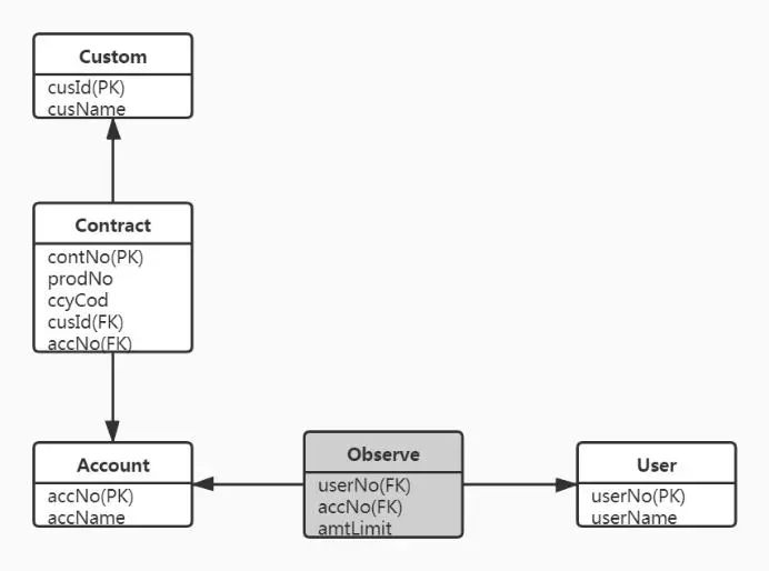 如图2所示,使用关系数据库创建一个客户合约动账跟踪的存储结构,必须为客户、合约、账户、用户单独创建表结构,各个表结构之间通过外键约束相互关联,对于多对多的复杂关系还须创建“中间表”(如Observe表),这消耗了大量的系统资源。