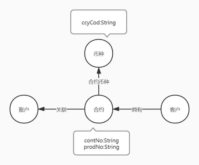这样需要遍历所有的合约节点,逐个判断币种属性,可以优化为图7所示,将币种属性作为节点提出,合约指向币种节点,这样在查询时只需要从币种作为头节点查询关联的所有合约即可,利用Neo4j免索引邻接的特性,大大提升查询效率。