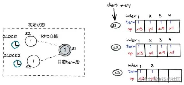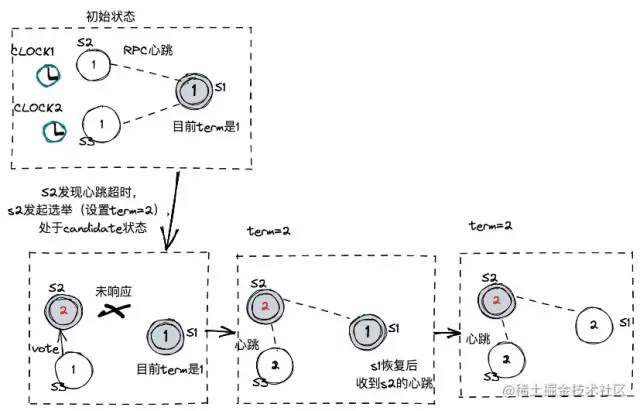 S2的时钟先发现心跳超时,发起选举,作为candidate投自己一票,S3也投S2一票,则S2当选为新的Leader。当S1和S2重新有心跳时,发现任期大于自己原来的任期,则也成为S2的follower。