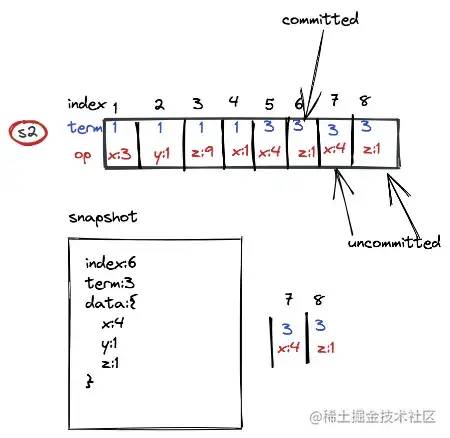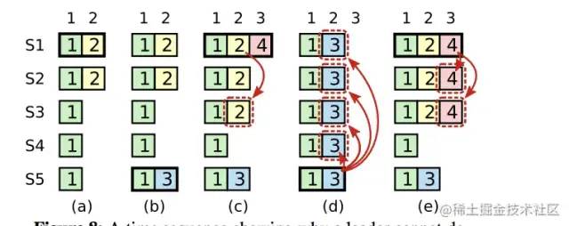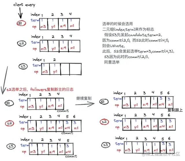 选举的时候会选用 二元组(index,term)来作为标志 假设S3先发起candidate,term=2, 因为commit(2,1), 而S2此时commit(4,1), 则会UNvote, 此后,S2会发起选举term=3,commit(4,3), S3因为此时的commit(2,1), 同意选举
